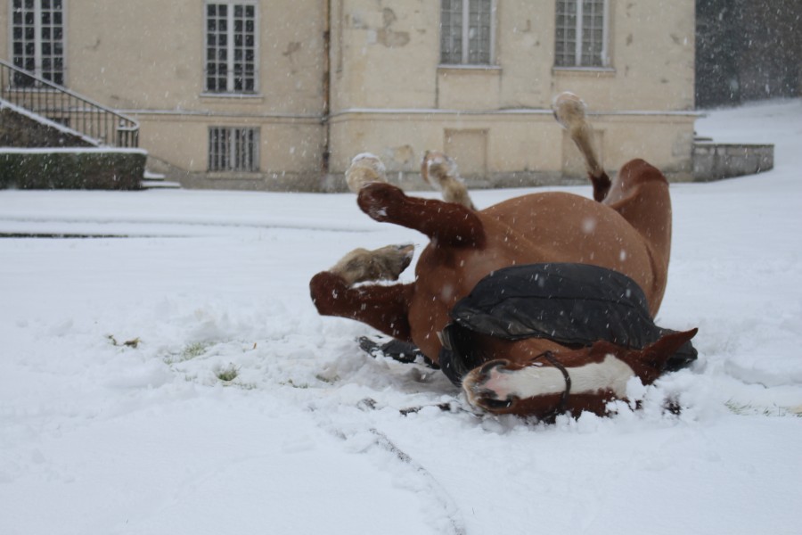 Je pense qu'il faudrait que je le galope longtemps, puisqu'à la deuxième main il a fini par se détendre et il a repris une attitude normale. Mais j'ai du mal avec le galop en longe, j'ai toujours peur qu'il glisse en faisant le mongolien