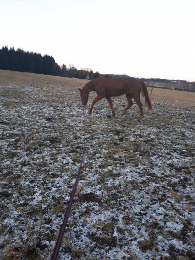 Et puis j'ai voulu insister un peu sur le galop. C'est toujours compliqué le travail au galop à la longe. J'en fais peu parce que je trouve ça difficile, mais quand même, il doit pouvoir faire quelques cercles au galop sans avoir la tête en l'air et la queue sur le dos.
