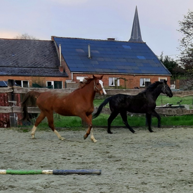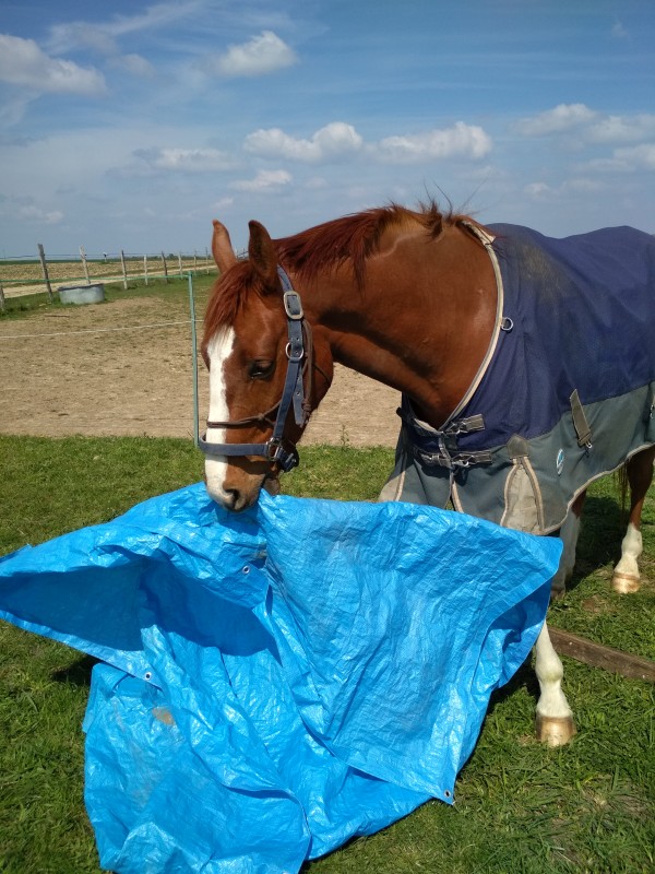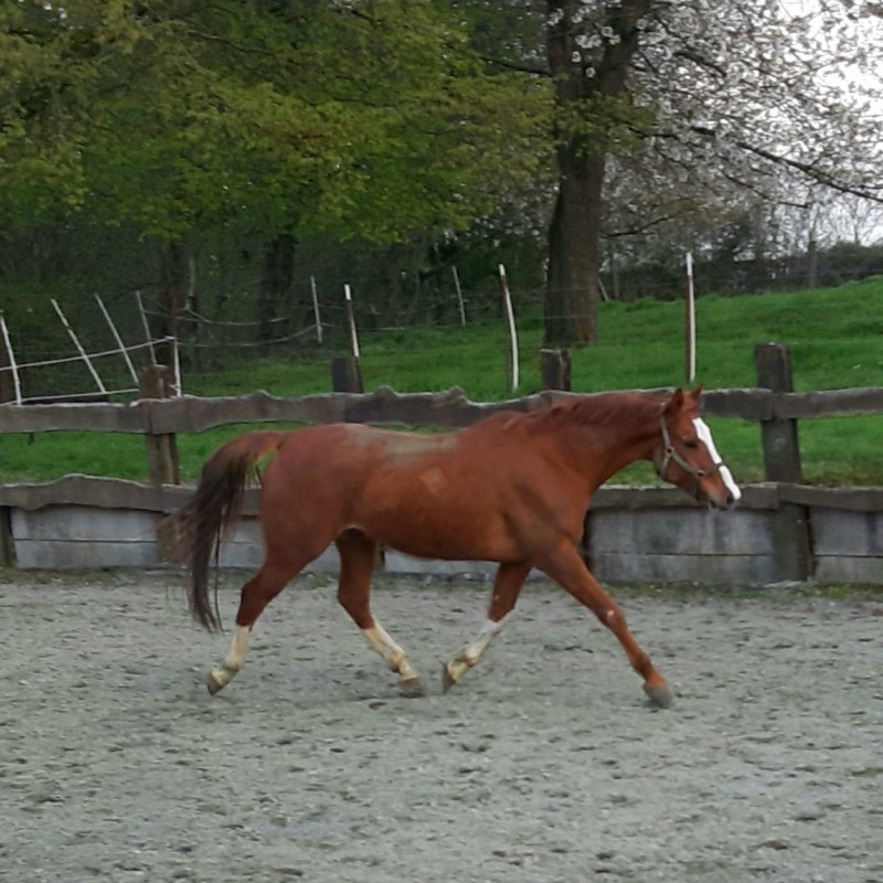 Pareil c'était très bien pour hier, ça l'obligeait à m'écouter et rester concentré plutôt que de "courir", et les transitions du galop c'est encore compliqué pour lui (il les passe mais en vrac). Donc là avec l'effet répétition on a eu des choses sympas, son attitude est encore flottante mais il venait s'arrondir tout seul par moments, et les transitions étaient nettes. Il est bien resté dedans pendant tout l'exo. Par contre j'ai trouvé qu'il avait un peu de mal à tenir ses cercles, ça lui demande encore des efforts, et je pense qu'il s'était un peu cuit tout seul à être speed comme ça, il avait bien transpiré à la fin. Donc on a fini sur un cercle propre (entier au galop) et c'était bien.