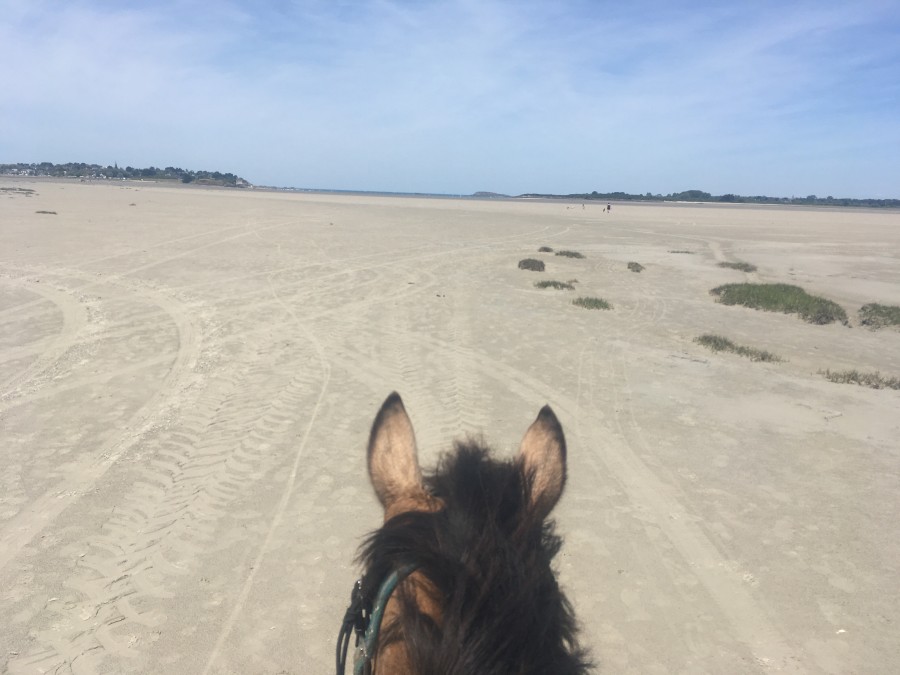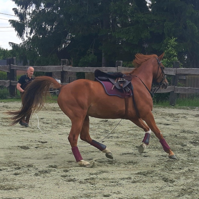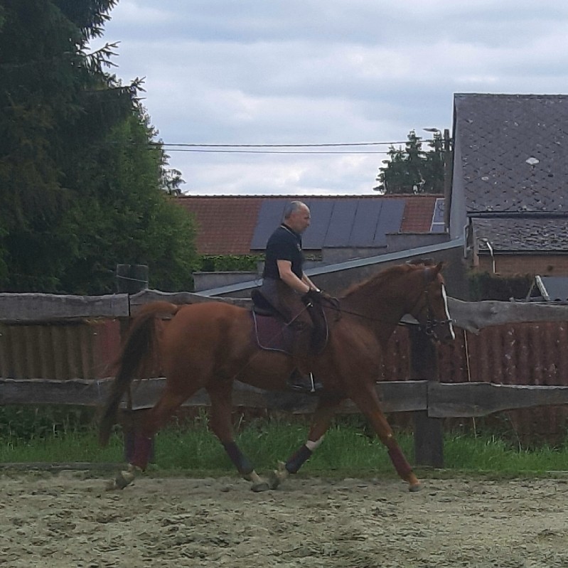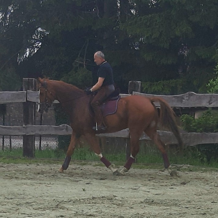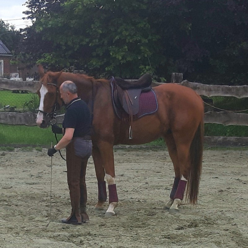 Forcément il me colle un départ au galop à faux. Je repasse au trot pour corriger -> première erreur, j'aurais du le laisser fauter pour ne pas le contrarier et bousiller le reste de ma reprise.
