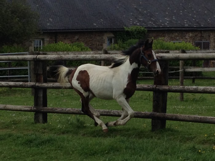 Sinon pour l'instant le manège n'est pas praticable parce que l'arrosage a été oublié et qu'il est inondé en partie, mais dès qu'on peut y aller, elle en fera le tour... Notre manège est sous mégadôme, donc la bâche a tendance à faire un peu peur si il y a du vent, la porte est coullissante et le son fait un peu d'écho.