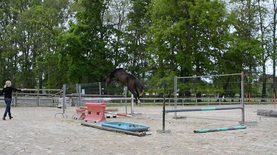 Bien sûr on a pas fait ca aujourd'hui, on a fait que la mise en condition. La séance a duré peut-être 15min dans le rond de longe + tout ce qu'il y avait autour puisqu'elle l'a géré de A à Z du pré au pré