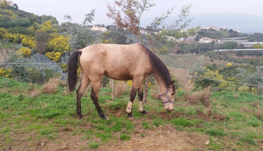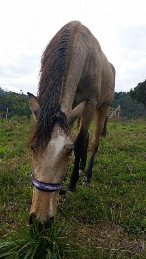 "A cause" de la région dans laquelle je vis, pas de grand pré pour elle malheureusement, mais un beau paddock avec une copine, et des copains juste à coté (ils mangent presque ensemble). Je m'arrange donc pour la mettre au "pré" dès que possible, pour brouter un peu et se défouler :3