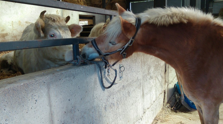 Donc zou à l'attache pour un coup de brosse, et là, séance de bisous avec ses copines, les vaches. (elles n'ont pas arrêté jusqu'au départ, soit pendant bien 30 minutes).