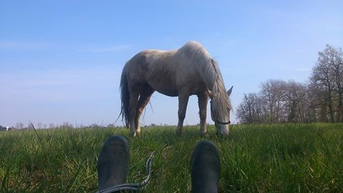 Suite à ça on a fait une pause dans le pré derrière l'écurie. Moi j'étais vautrée dans l'herbe à réfléchir au sens de la vie (ou pas) pendant qu'elle se régalait. C'était une belle pause, qui a duré une heure passée. Top moment, avec le beau temps!