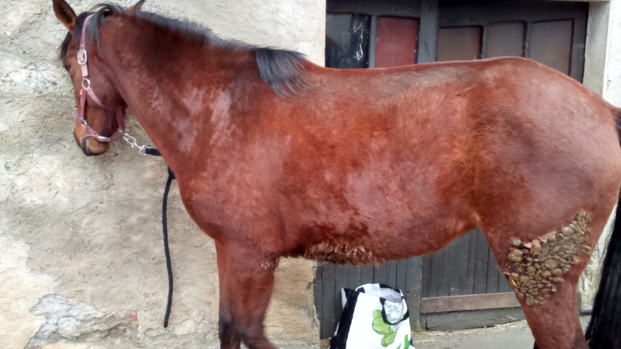 nom: Horizon de la Chapelle (robe: Alezan, possible Dominant White ou Sabino)