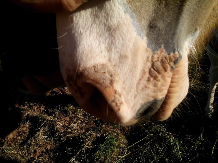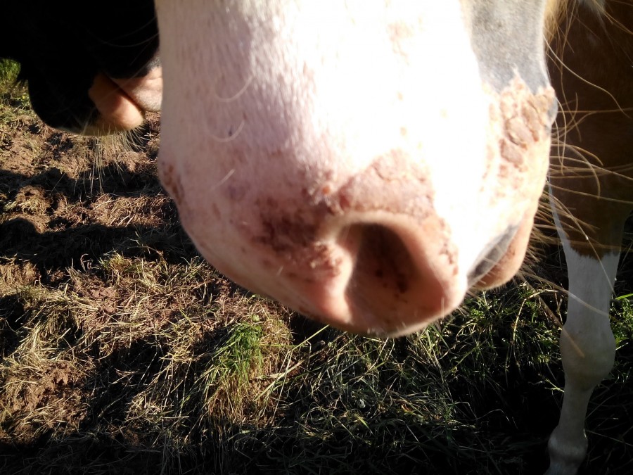 Je dis peut être une bêtise mais....Un coup de soleil ? Avec les chevaux qui ont la peau rose sur les naseaux, c'est possible....