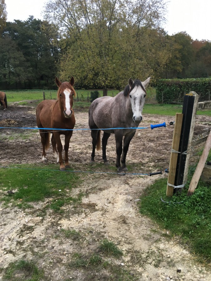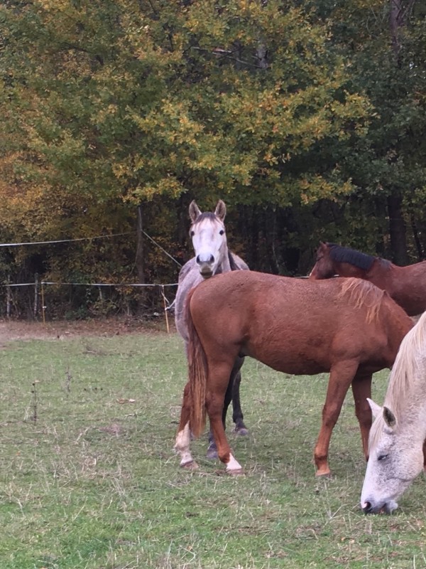 J'aime bien sa tête sur cette photo "oooh c'est moman". Il est avec ses 2 grands copains, l'alezan 1 an et le gris 8 ans.