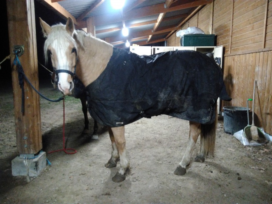 Voilà et sinon j'ai mis la couverture à Diablesse ce soir car il commence à faire bien froid et ils n'ont pas de foin à volonté (à juste titre, sinon je rappelle qu'elle en devient obèse). Du coup ça lui file un petit coup de pouce. En plus on a eu pas mal de pluie ce week-end, donc c'est boueux et j'ai pas le temps de la nettoyer comme il faudrait avant de monter en cours car après le boulot c'est trop juste en timing. Je ne peux y passer du temps qu'apres les séances, ce qui n'est pas hyper pratique hormis pour la faire brouter (elle ne s'en plaint pas !).
