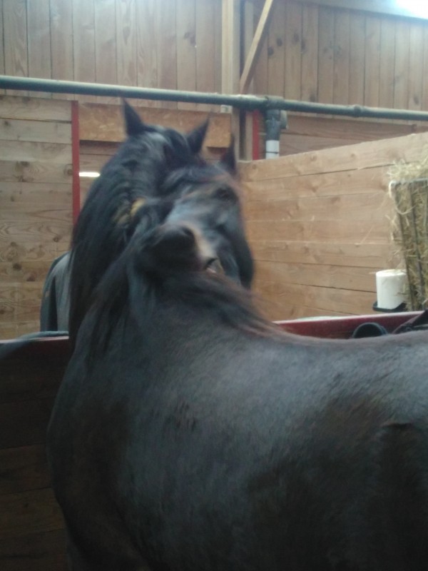 M'en parlez pas, top le soleil le soir en sortant ! Pas grand chose nous, Denali a encore du mal avec Libby, elle l'a rejette, lui empêche d'accéder au foin... ça va un peu mieux aujourd'hui mais j'vous dit pas les traces de morsures qu'elle a la pauvre... Faites que ça passe!!! Bon au box, elles sont copines si y'a pas de bouffe...