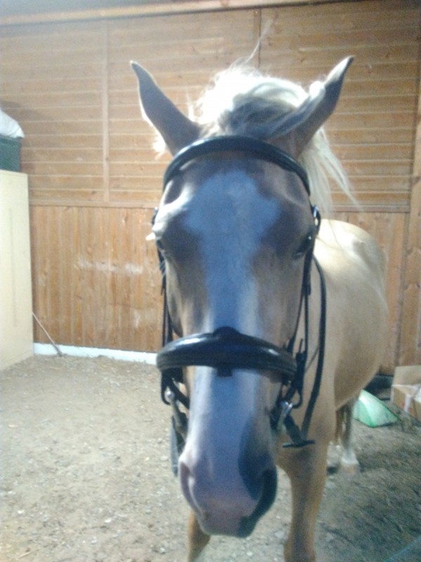 Hier j'ai essayé le filer à Diablesse (sans monter). Niveau têtière et frontal, elle va vraiment trouver beaucoup de confort par rapport à l'autre je pense, ça a vraiment l'air de bien se caler comme il faut. La muserole fait un peu massive mais je m'y attendais. Le cuir est encore un peu raide du coup au niveau de la fermeture ça fait un peu gros, mais ça ira mieux quand ça sera assoupli.