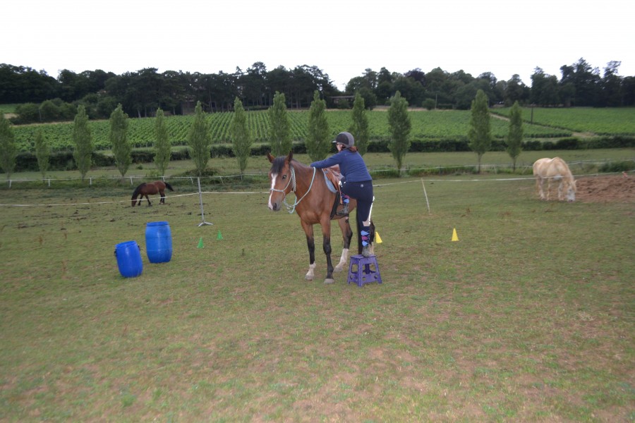 Avec tout le travail à pieds que nous avons effectué en amont, je me suis dit qu'il n'y avait aucune raison que ça se passe mal. Dancer connaissait déjà tous les codes a licol (flexions d'encolure, reculer, mise en avant avec le stick à l'épaule..), j'ai donc fait quelques séances de longues rênes avec la selle (qu'il a déjà eu sur le dos l'année dernière) pour préparer le fait que je ne sois plus à son épaule. Une fois tout ça en place, à la fin d'une séance, je suis montée en sac à patate, ne voyant aucune réaction, j'ai passé la jambe et me voilà sur son dos !