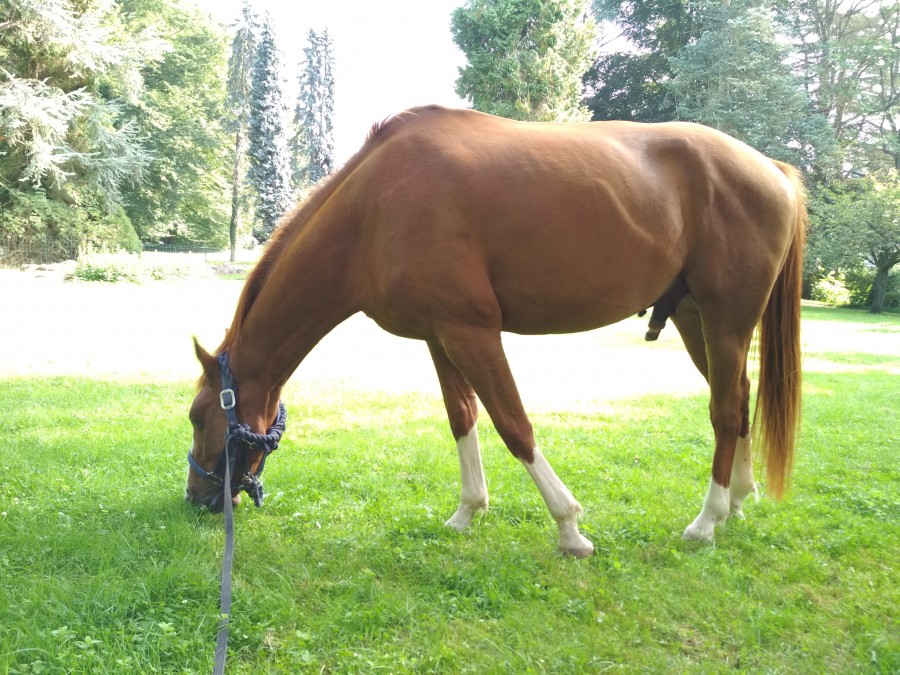 Il a vite tendance à se durcir et à accélérer. En freinant le trot et en le pliant un peu il se décontracte.