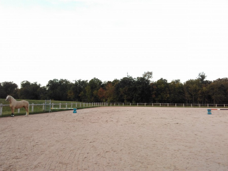 Ça fait donc deux nuits qu'elle porte son panier et pourtant ce soir elle était comme une folle a la longe !! Les premiers tours elle n'avait que l'option galop pleine balle (en sautant les barres au sol que j'avais installées aux extrémités du cercle) ou carrément trot passagé, queue en l'air des que je réduisais le cercle pour la freiner. Voila, voila... Pas de problème d’énergie a priori. On a quand-même réussi a faire l'exercice en montant des petits verticaux. On a fait plusieurs passages aux deux mains. La technique commence a venir, elle tente des approches différentes pour voir comment ca marche. Elle m'a fait sa première longue, et aussi un dernier saut super articule, ou elle a pousse fort et bien passe le dos, avec une jolie marge, j'ai laisse la-dessus.