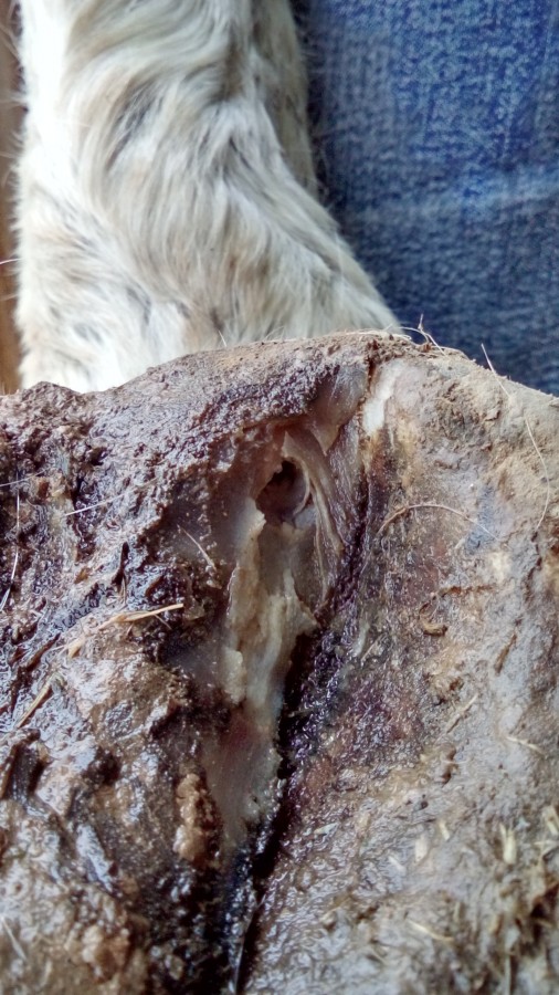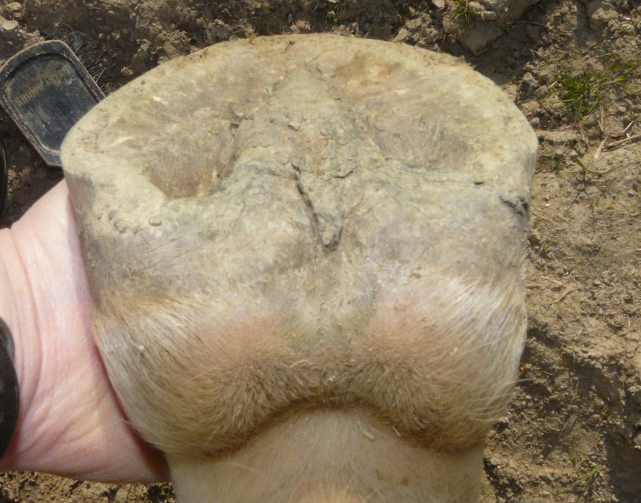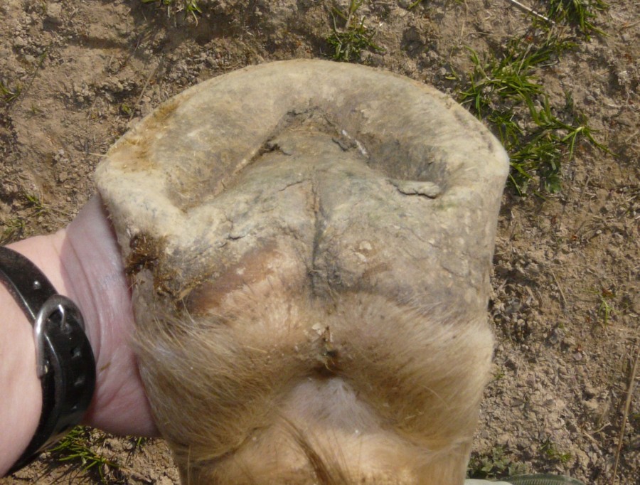 j'ai curé et brossé les pieds et un morceau de la fourchette du postérieur côté extérieur était bien "soulevée " et tout moux, un tout petit peu de liquide est sorti.