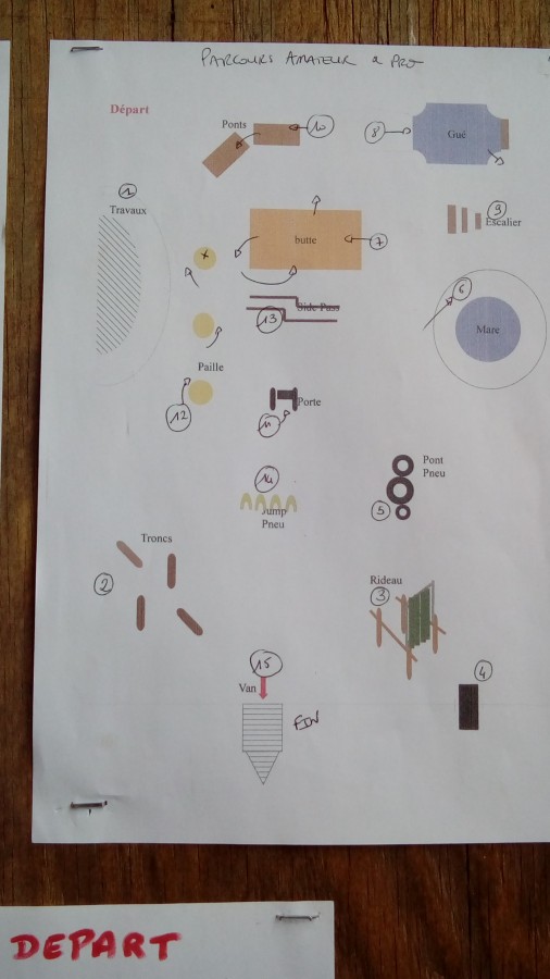 On avait cours dimanche, fait dans un champs avec plusieurs ateliers, troncs, pont à bascule, gué, etc.