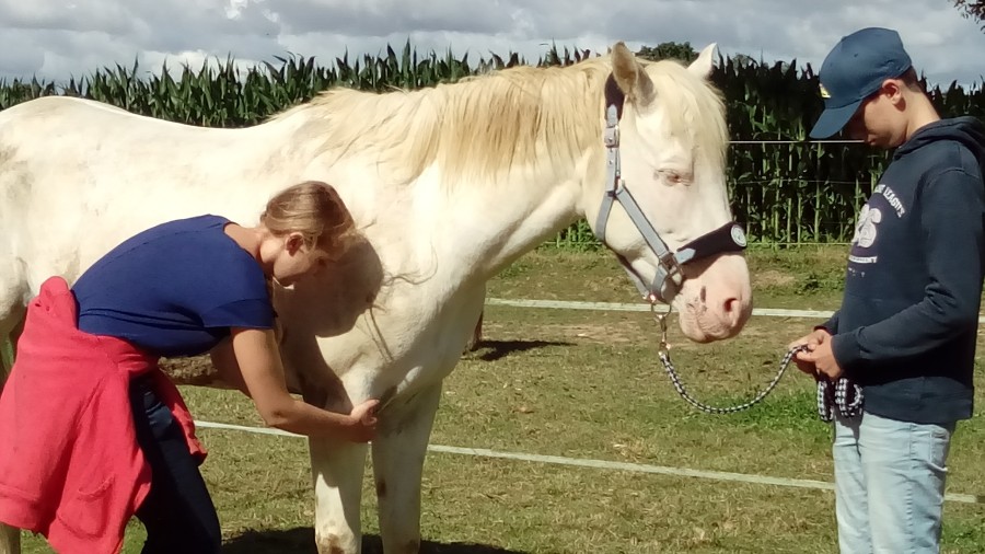 - austin couillon dès la détente !!! en mode "mais ma copine n'est pas avec moi, ça me stresse, je veux pas" et a commencé à se pointer (bon pas trop haut heureusement) à donner des coups de cul, mais super Pauline était là et a même du monter sur la bête... il faut être ferme pour lui dire ce qu'il n'a pas le droit de faire et le rassurer en même temps ! kilian l'a repris et a pu faire son tour, il y a encore eu un déclic pour les positions de mains et oser lui parler, même en public. le pépère l'a embêté 3 fois sur le parcours, mais il a passé tous les ateliers. pédiluve un peu de mal, mais le gué nickel. il est même revenu au galop ;)