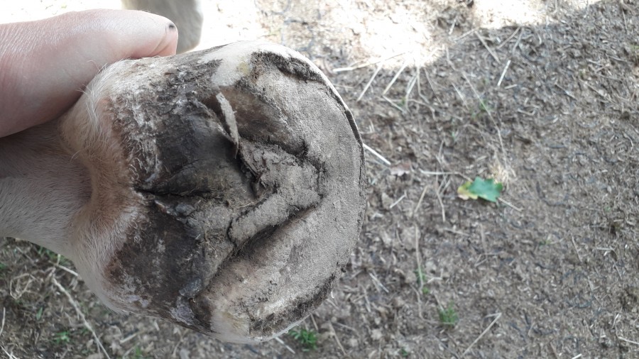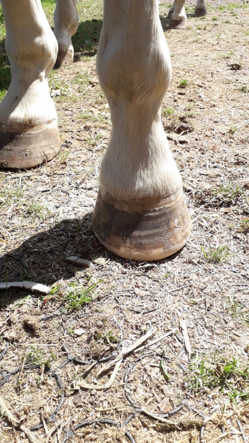 Cet hiver, avec l'humidité et ses pieds en gruyères, elle m'a fait un légère mue de sabots... du clou qui dépasse jusqu'au fer, 2-3 mm de corne se sont décollés sur les antérieurs. Aucune boîterie par contre, pas du tout génée.