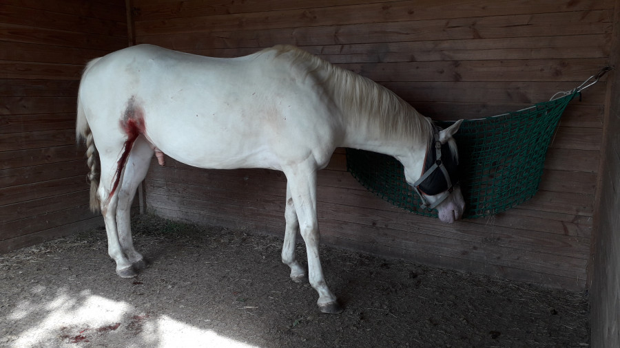 Au bout de quelques mn, tapait un peu du postérieur (bon, y'a des mouches en plus), mais n'a même pas essayé d'avancer ou reculer, alors qu'il aurait pu se sentir coincé.