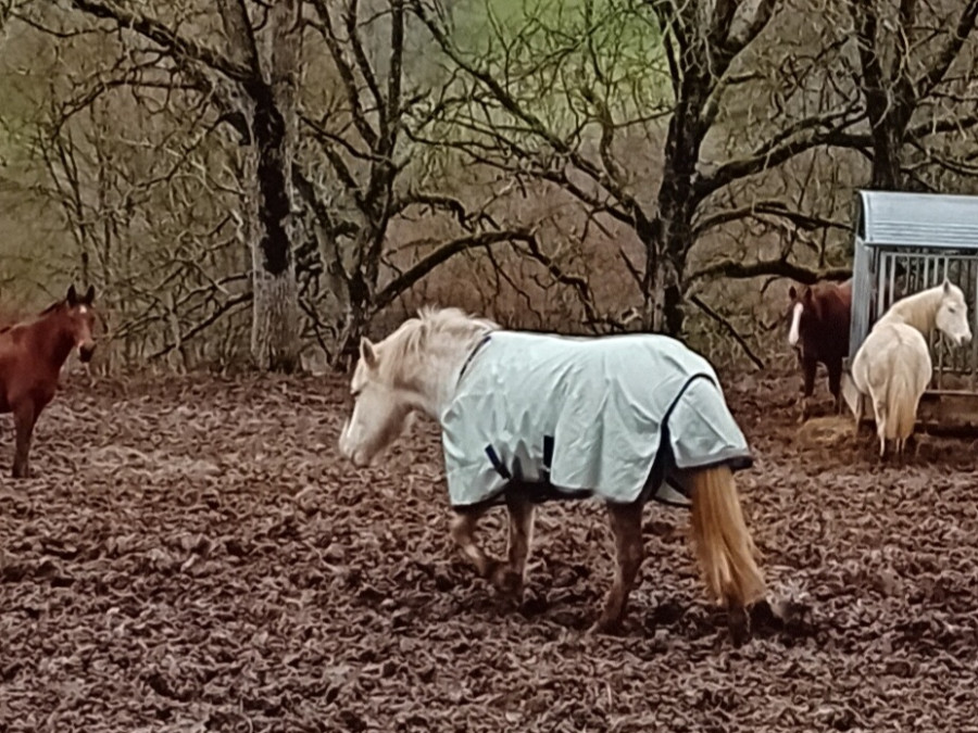 Retournée au pré elle a eu du mal à accéder au foin. Elle s'est fait chasser par quelques autres. Mais malgré boue et couverture elle bougeait correctement.