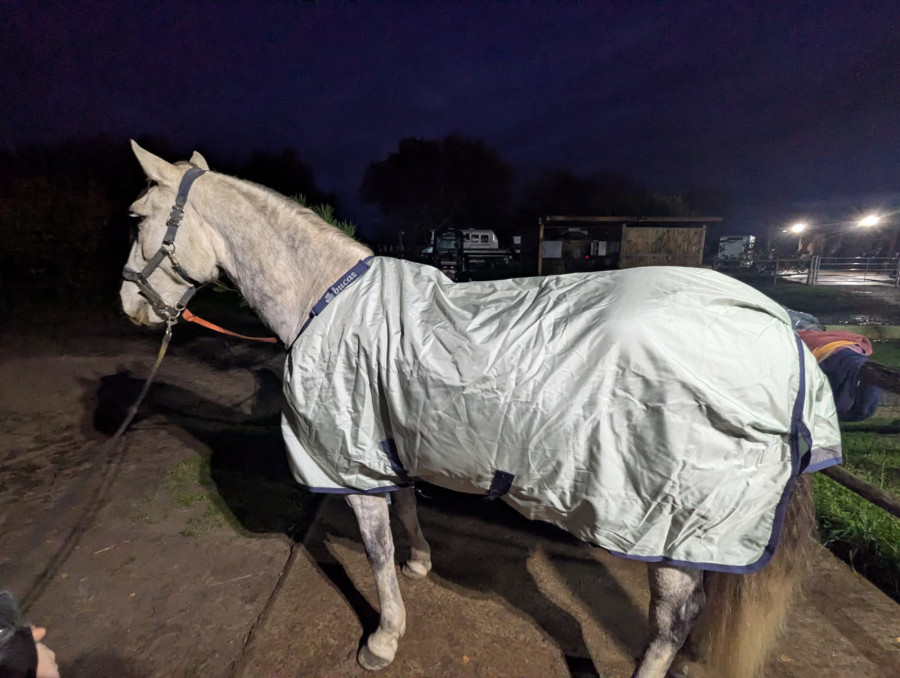 Couverture et couvre cou mis pour la premiere fois « pour de bon » hier, juste essayés avant par-dessus une séchante au cas où la taille n’irait pas. Verdict : la taille tombe pile poil, le couvre cou est un poil grand à la rigueur mais franchement je préfère ça, au moins il va rester bien protégé même avec la tête en bas pour brouter. Et surtout, quasiment pas de trou devant entre la couverture et le couvre-cou !!