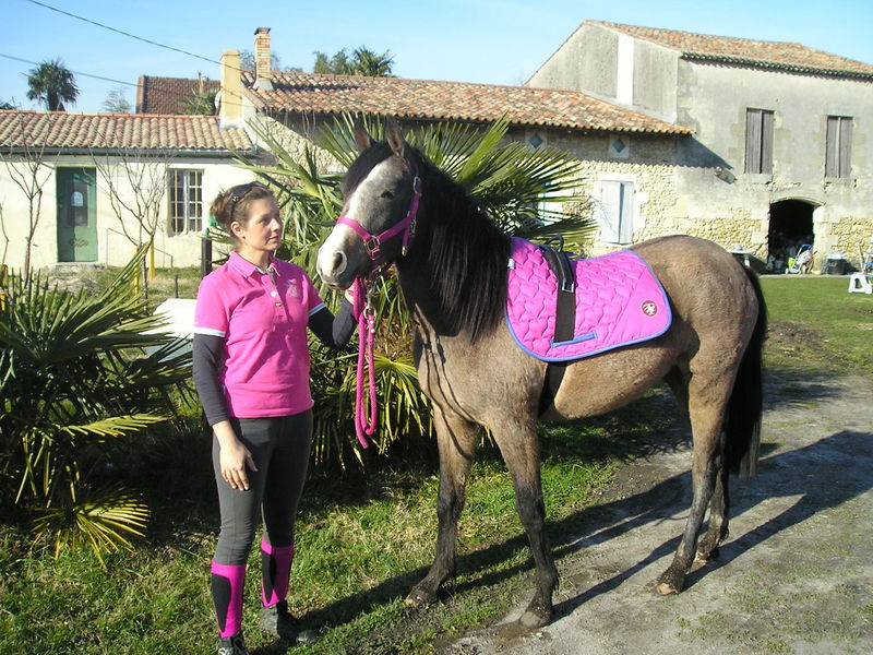 Mais cet aprèm j'ai sorti la pouliche en main et je lui ai mis le tapis sous le surfaix (je commence à l'habituer à la pression de la sangle).