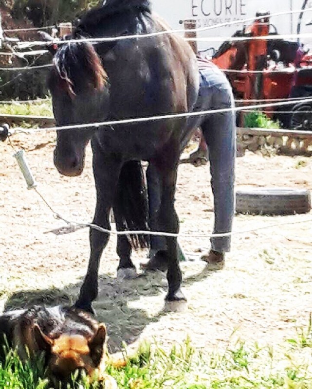 Son noir, cheval qui cherche le contact facilement me demande des gratouilles du bout du nez et on ne sait jamais si j'ai pas un truc à grignoter. Le cheval avec la vrai bonne tête du Loulou bien dans ses sabots. Au travail un cheval froid têtu voir même facétieux. Très agréable à regarder, tout dans la décontraction qui semble faire les choses facilement. Bref le cheval très sympathique avec très sûrement de gros moyens !
