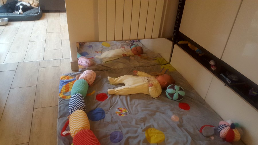 Au fait, j'ai enfin trouvé une solution pour le miroir :) Je suis allée chez ikea, j'ai acheté 4 miroirs incassables à 5e chacun et je les ai collés sur un carton. Franchement ça rend pas mal du tout ! En tout cas Lucie n'a pas l'air perturbée du tout ^^ Et moi je suis rassurée !