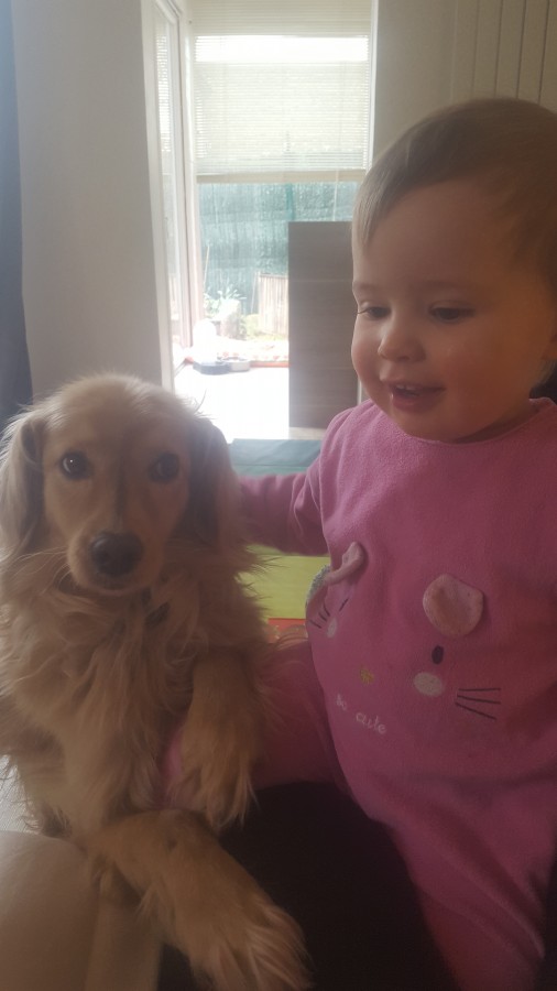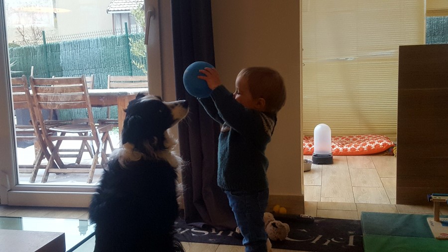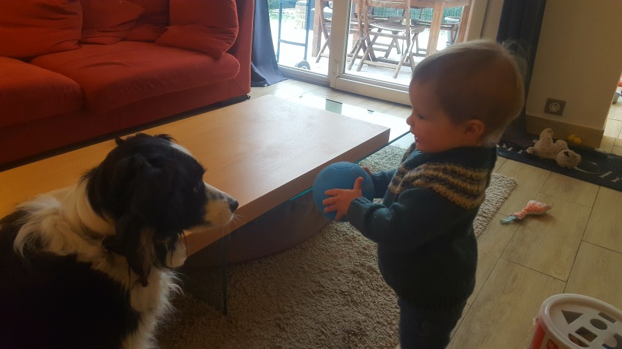 Olivia adore jouer avec le chien de la nounou, elle va chercher les jouets du chien et joue avec lui c'est trop mignon.