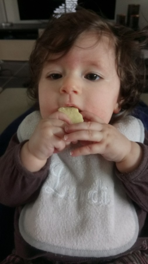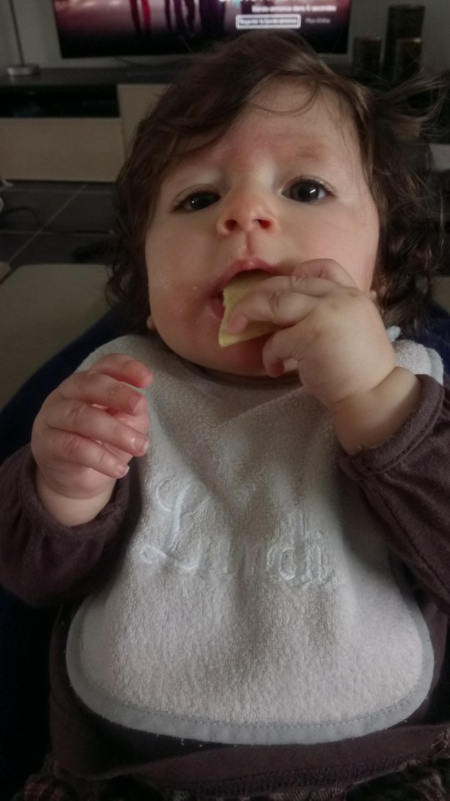 Je lui ai proposé mon gâteau toute à l'heure et elle l'a bien apprécié, au fur et à mesure que qu'elle le cassait je mangeais les morceaux et quand y en avait plus elle s'est mise à pleurer la pauvre... Elle avait pleins de miettes dans la bouche, elle a fait quelques tir au coeur mais quand j' ai voulu les lui enlever y en avait plus et rien sur le bavoir donc elle avait finalement tout avalé !!