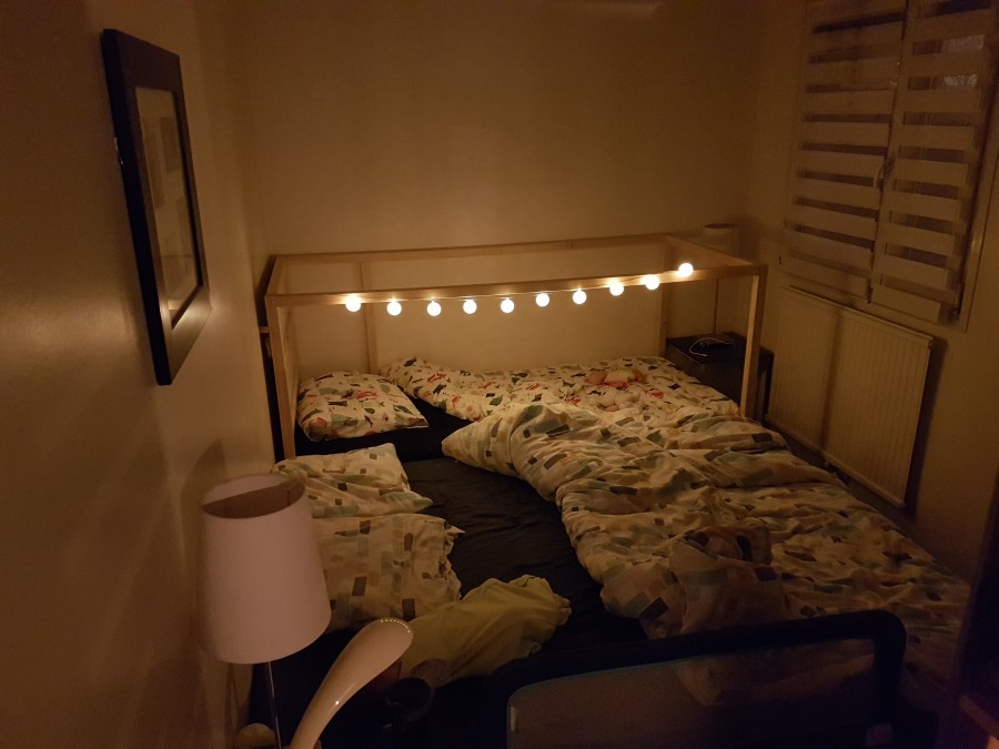 On a enfin troqué le lit cododo à barreaux contre un vrai lit pour Lucie (toujours en cododo^^) 90x200! Ça nous fait 2m50 de surface pour dormir c'est trop bien !