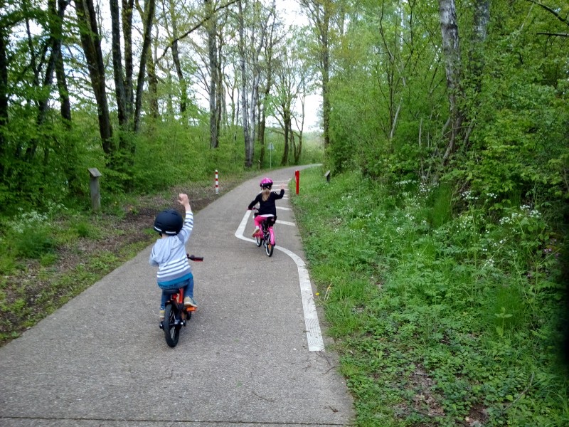 D'abord un chouette parc avec quelques petits animaux (vaches Highland, chèvres, lapins, oies, mouflons, daims, etc.). C'est très joli, avec du bois partout et des modules (souterrains et aériens) imbriqués dans les structures. C'est entièrement gratuit (même le petit sac de granulés pour animaux). Le parc est entouré de forêt et, comme il y a un parcours mountain bike qui traverse le parc, les vélos sont les bienvenus. Du coup, Marion a circulé à vélo. Nous avons découvert ça l'an dernier (je pense que j'en avais parlé) mais il était en travaux l'année dernière car ils créaient des logements de type cabane sur le site.