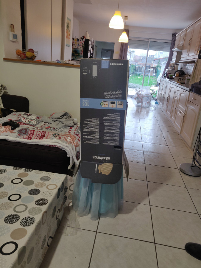 Ici aussi, quand une boîte débarque, elle connait immédiatement un second souffle. Maintenant, ils les détournent aussi pour en faire des "cabanes pour le chat". Le chaton s'éclate à jouer / se cacher; il se fait parfois des délires tout seul d'ailleurs!