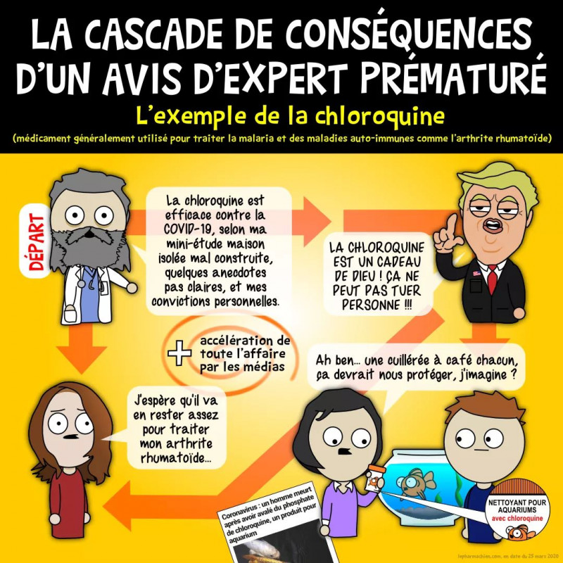 S'ensuit une série de conseils prématurés et exagérés, un engouement populaire pour le médicament, et une crainte de pénurie de chloroquine, qui est normalement utilisée pour traiter des maladies critiques comme la malaria et l'arthrite rhumatoïde. En plus, c'est un médicament qui peut avoir des effets secondaires sérieux si mal utilisé.