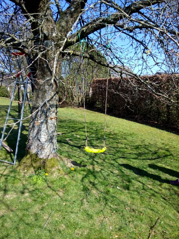 On a de nouveau chipoté pour accrocher des agrès au cerisier (on a essayé avec une échelle et une balançoire classique). Pas encore 100% convaincus du système. A voir...