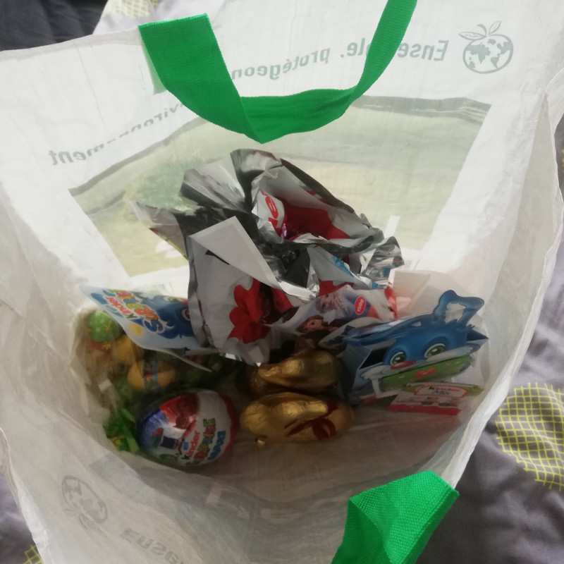 Le papa a été faire les courses ce matin il a pris pour pâques, il a craqué