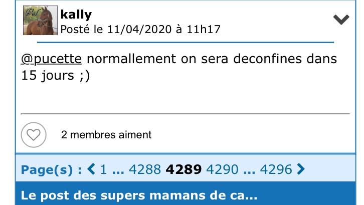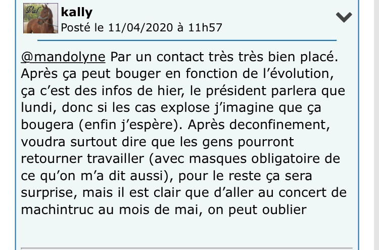 mil0u78 oui ça vient dune source sur. Y’a des acteurs dans ce pays qui sont forcément au courant avant car ils doivent « préparer » les décisions du gouvernement. Bref. J’aurais pas dû en parler et voilà, mais moi jetait happy de l’apprendre car comme certaines je suis en galère de fringues et de chaussures. Moi ça me fait rire car mamzellec elle elle avance que les gamins rentreront pas avant septembre et qu’on sera confiné pendant tant de temps avec comme source BFM, mais là ça choque personne... Faites ce que je dis pas ce que je fait, c’est du foutage de gueule sérieux... Mais bref, d’avenir je garderais mes infos pour moi pas de soucis. De toute façon c’était pas le post fait pour en discuter. J’aurais pas dû repondre quand on m’a posé la question pour que je developpe. De toute façon sur ce post le droit dexpression est réserver à certaines apparament.