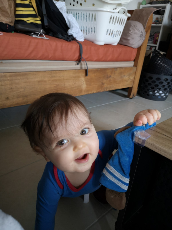 Le matin depuis le début du confinement, il ne fait plus la sieste, maintenant qu'il cavale à quatre pattes, il semble vouloir jouer/explorer/découvrir. Arrivé un peu avant midi il commence a fatiguer, alors on mange et on va faire la sieste... Pendant laquelle ça fait quelques jours qu'il dort allez, une heure... alors les fins de journées sont longues.