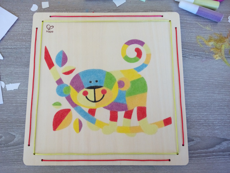 Pendant ce temps-là, Romain tournait en rond. J'ai fini par aller dans ma réserve de cadeaux (j'ai toujours un stock de quelques cadeaux / petits jeux de voyage / livres) et j'en ai sorti ceci (que j'avais au moins depuis 4 ans mais jamais eu l'occasion de le sortir, Marion ayant reçu des Sablimages et assimilés en quantité depuis lors). C'est le principe du sable à coller mais sur une jolie plaque en bois (+ cadre en fil à réaliser aussi). C'est Hape qui faisait ça (je ne sais pas s'ils le font encore).