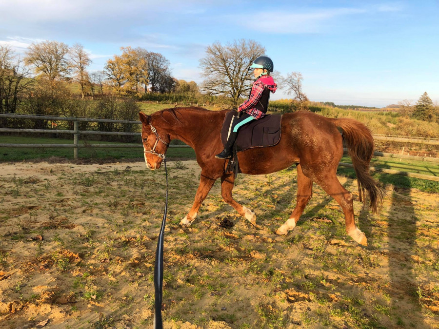 Il y a 3 semaines, elle a galopé toute seule (sans longe) pour la première fois (elle avait galopé 2 fois en longe précédemment). La petite jument lui donne toujours un peu de "fil à retordre" en début de séance (elle la "fait tourner en bourrique", essaie d'aller où elle veut) mais la puce arrive toujours à se faire entendre / comprendre (et une fois que la ponette a compris qu'il y avait quelqu'un aux commandes, elle va super!).
