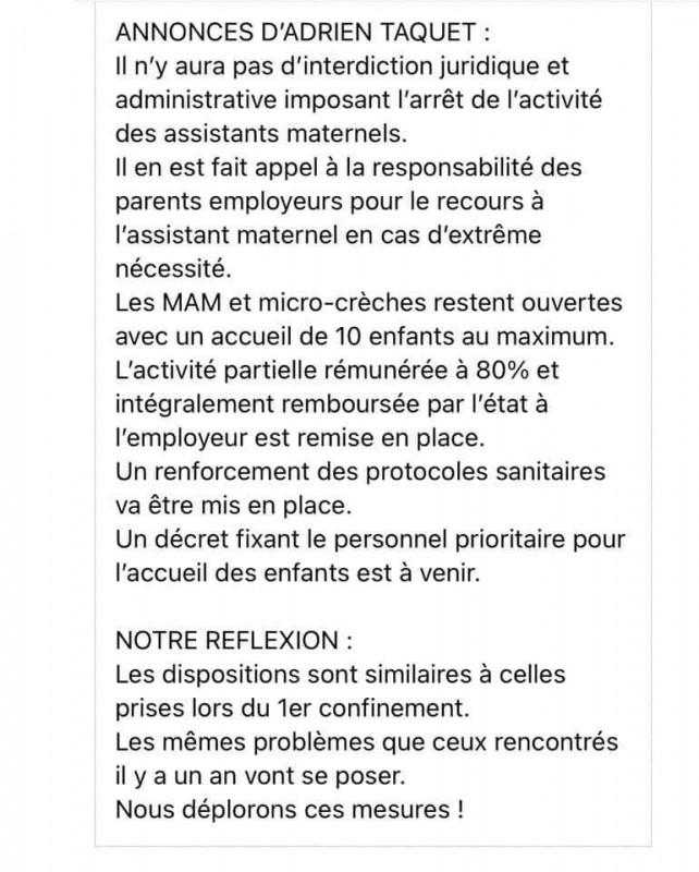Le gouvernement veux stopper la propagation mais quand il prend une décision forte il fait marche arrière de peur de se faire mettre à l'amende par une partie infime du métier, parce que certes il y avait pas mal d'assmat qui voulaient continué à bosser normal mais d'autres étaient prêtes à stopper l'activité et réserver leurs temps à ceux vraiment dans le besoin...