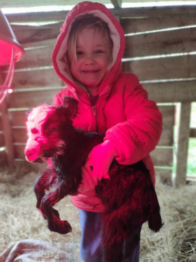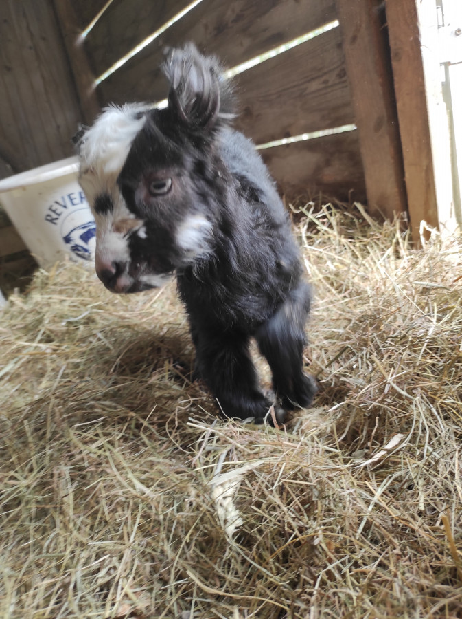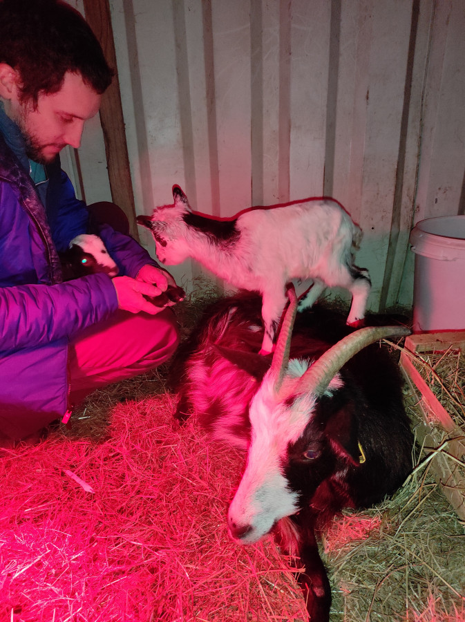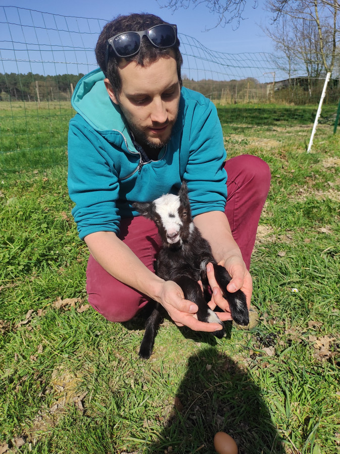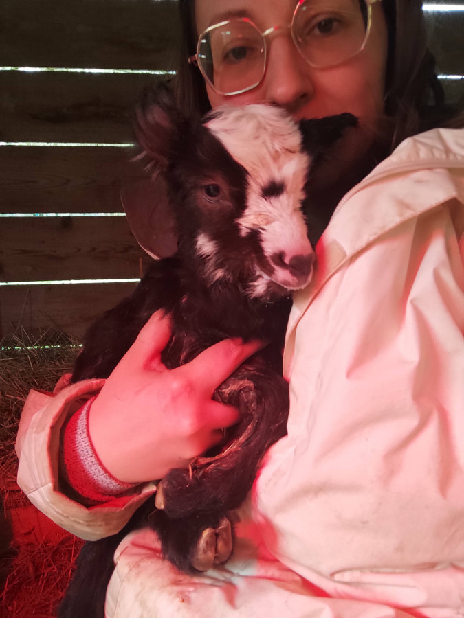 Avec Adrien, on se dit que ça risque d'être trop long. Sur une contraction, Adrien va donc chercher les pattes pour les sortir et le reste suit tout seul ! Le véto arrive 5 min après et nous dit que le chevreau n'aurait effectivement jamais pu sortir tout seul dans cette position.