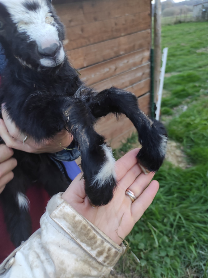 3eme photo : avant hier, petit moment sans attelles, il est allé marcher et se tenait parfaitement sur le bout des onglons ! On a bon espoir qu'il ait une démarche presque "normale" à terme.