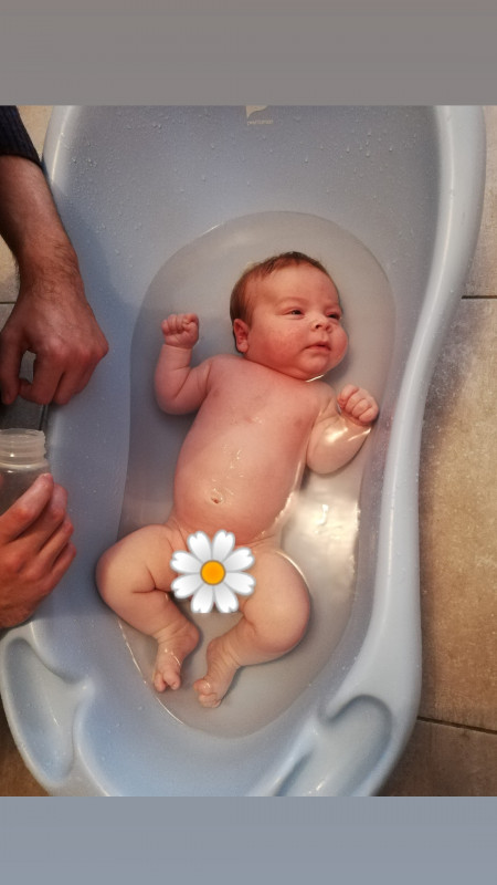 Je t'ai retrouvé une photo de Simon. Ici on l'a fait des 1 mois et demi mais Violette préfère largement les douches en peau à peau.