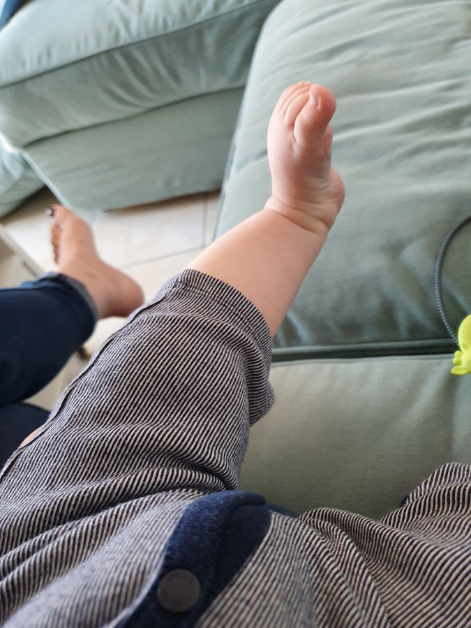 Donc son frère se retrouve avec un pyjama sans pieds (bon ça c'est ok) mais en taille 9 mois! Il rentre dedans mais ça manque de longueur...! (A 4 mois et demi on l'habille en 12-18 mois...!)