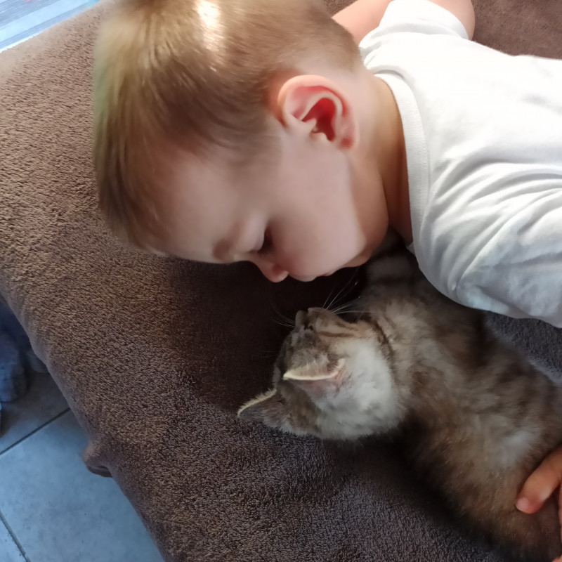 Il joue avec les chats, il va dans le jardin faire du toboggan et fait des gommettes aussi.