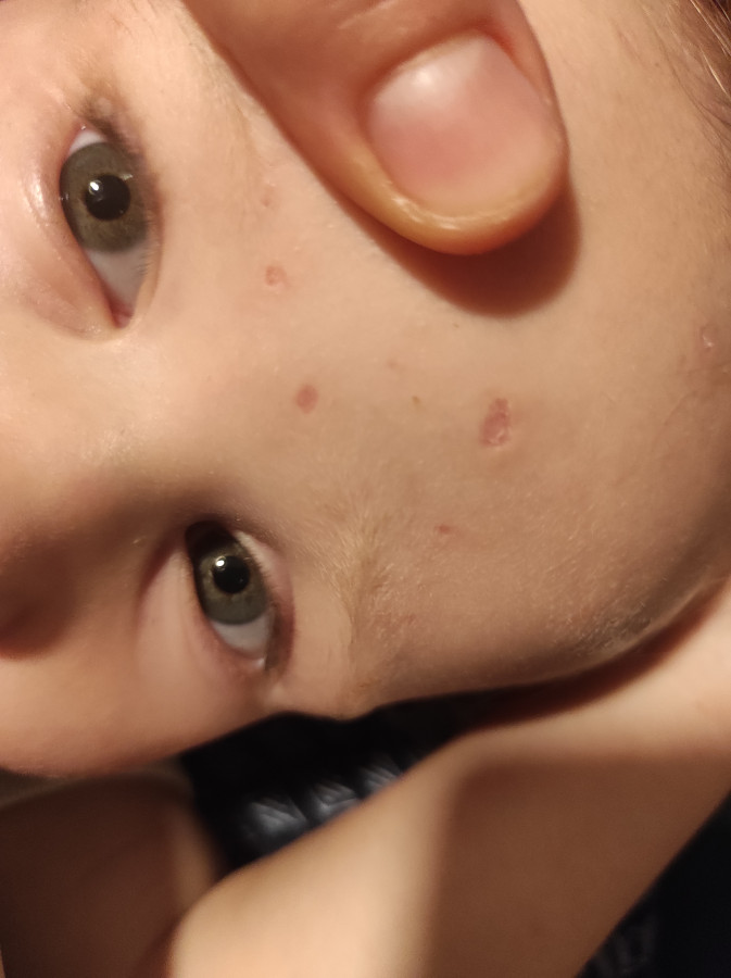 Sur le corps il a encore les traces de tous les boutons mais c'est juste la couleur de la peau qui est différente, je pense que ça va s'atténuer. Sur le visage ça fait vraiment des creux...