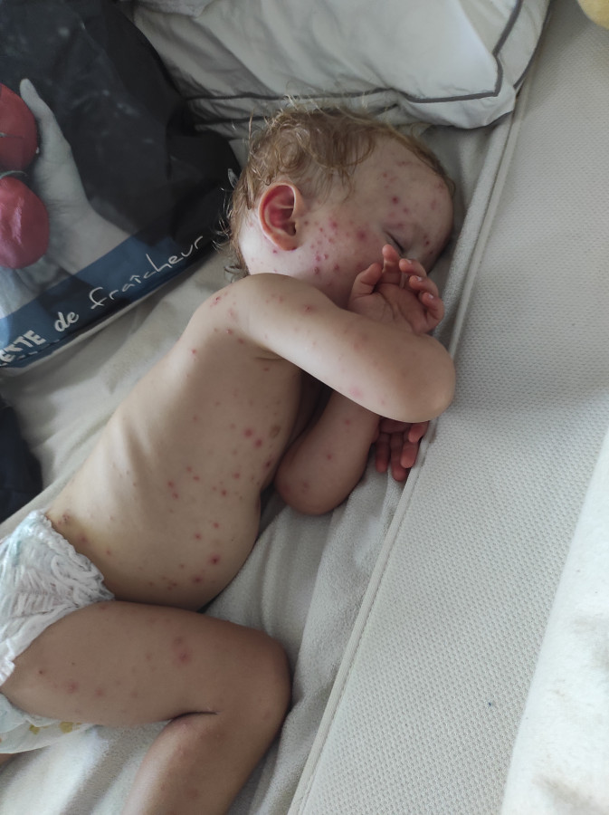 Alix et Elio ont eu la varicelle cet été, chez Elio ça a été assez terrible. Il garde des cicatrices énormes sur le visage, ça fait des trous.