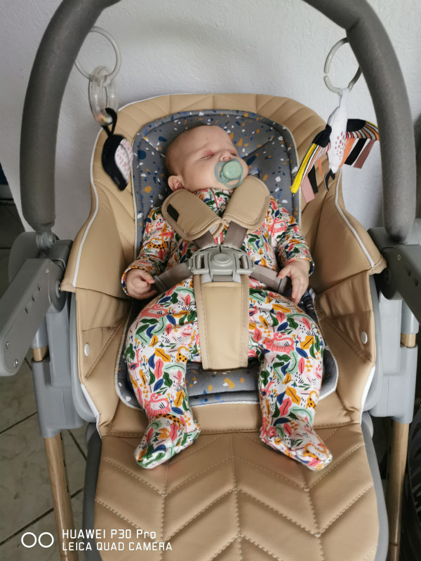 Ensuite elle s'éveille. Elle gazouille, elle tape dans ses jouets. Là je la sentais énervée et fatiguée donc je l'ai installé dans sa chaise de table en allongée. Comme elle est sur roulettes, je la balance 5mins et pouf elle s'endort.