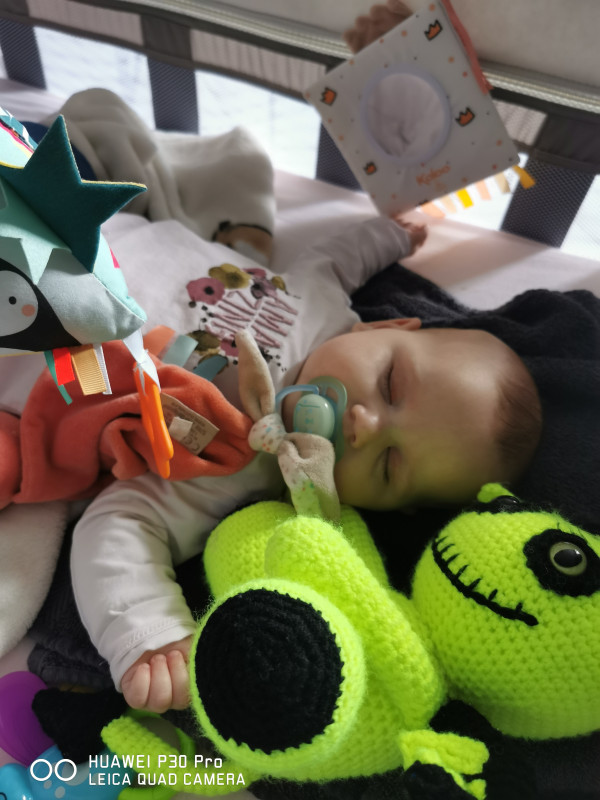 Comme ce matin, dernier bib 07h30, réveil 11h. Je lui fais des câlins, l'habille, je la monte avec moi au salon. Elle joue dans son lit le temps que je mange un yaourt et que je check mes mails. Je me dis que vers 12h15 je vais la redescendre dans sa chambre pour son bib et sieste.